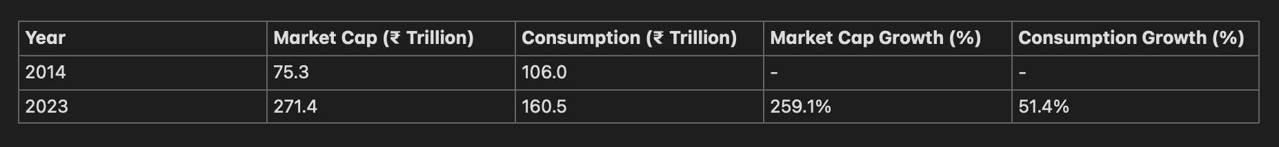 - Stock Market Boom: From ₹75.3 trillion in 2014, India’s market capitalization surged to ₹271.4 trillion in 2023, fueled by institutional inflows, retail participation, and speculative investments.