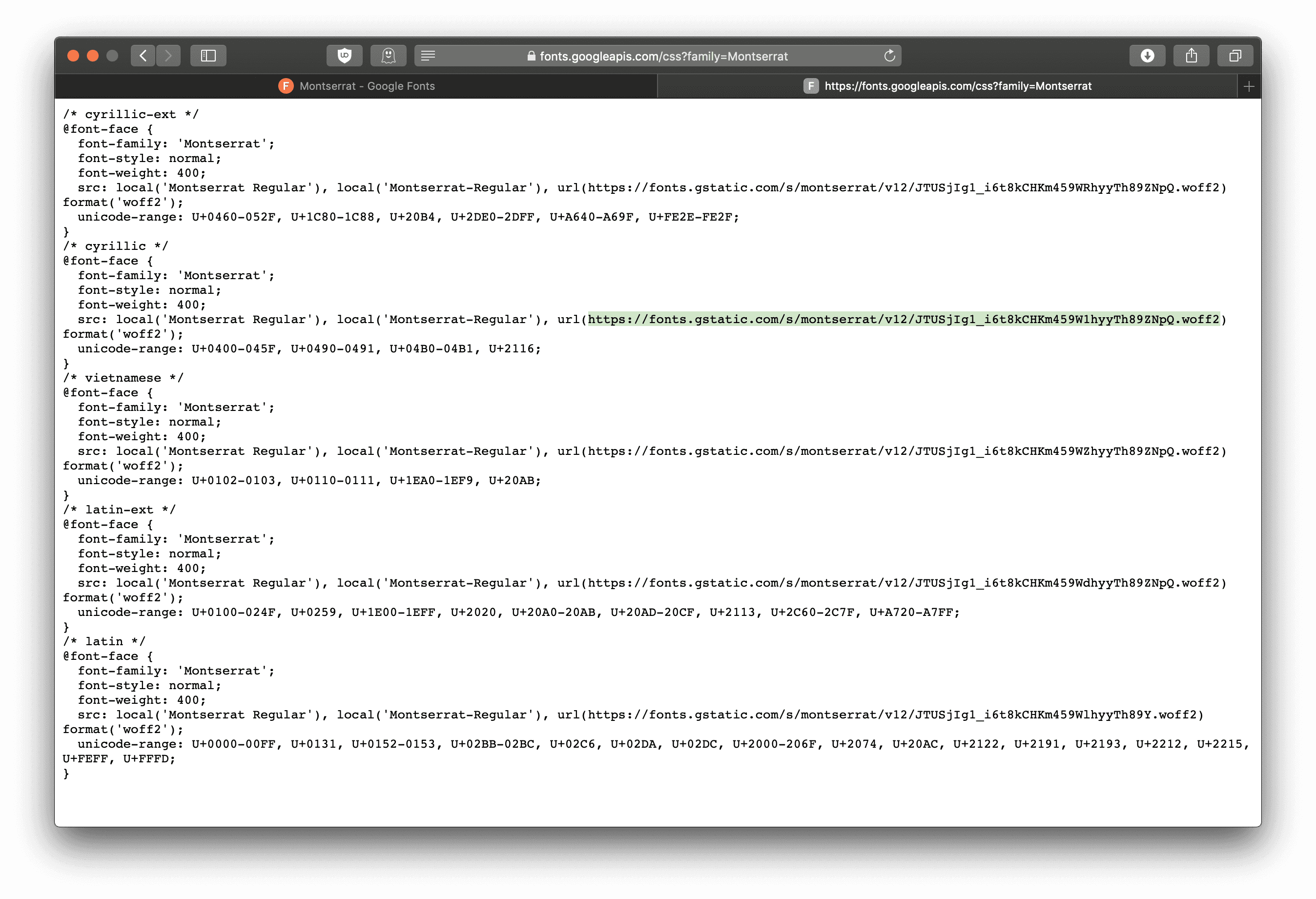 We see here that there are quite a few font files that the API pulled. Let’s say for this article that we don’t need the Vietnamese support. So, we just copy the Latin and Cyrillic parts of the stylesheet. In the code, we see, there’s a URL for the font file. We download the fonts using that URL and keep them in a local project folder. Now, all we need to do is replace the URL from the cloud-hosted to the relative address of the locally stored file.