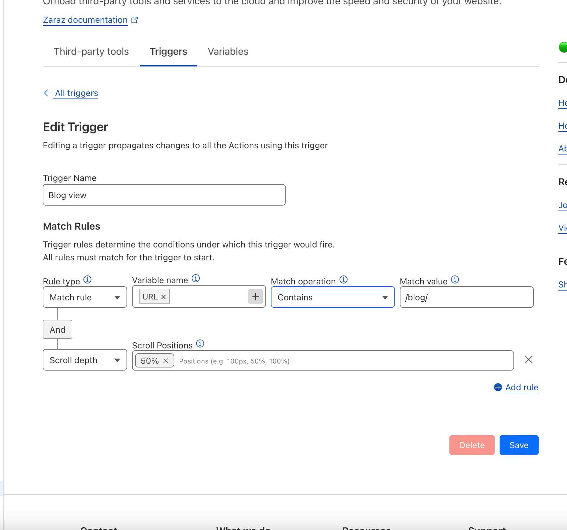 While Zaraz provides a default trigger i.e. Pageview, which loads on every page view, we don’t want to load Disqus scripts on every page, so we’ll create a new Trigger by going to Triggers tab and clicking on Create a trigger. We’ll add two rules to this trigger —