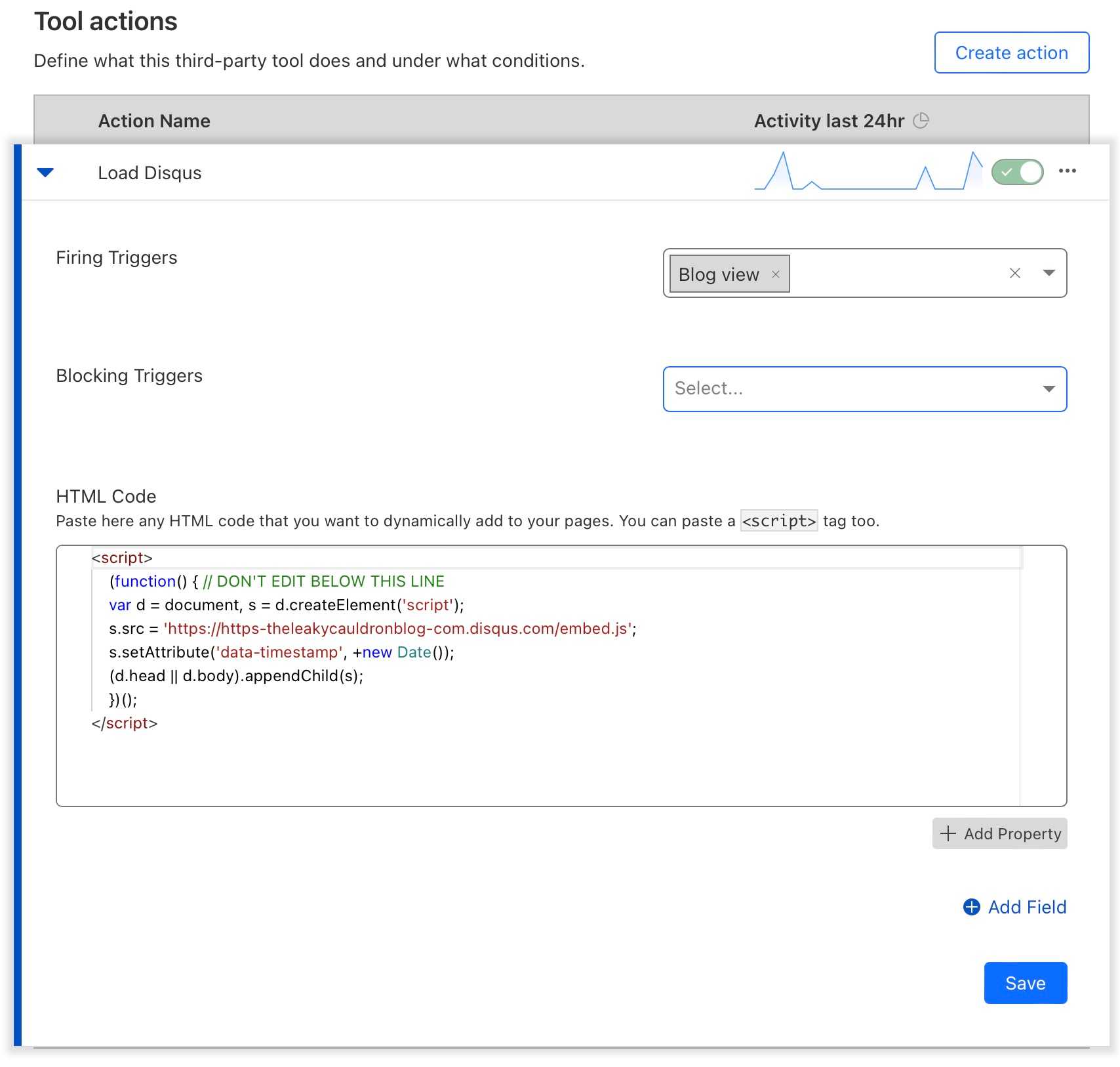 Then we go to the Third-Party Tools tab and click on Disqus > Edit and add the Trigger Blog view and the Disqus embed.js to it.